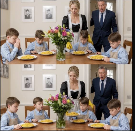 Quattro maschietti, più o meno di quattro anni. Magri, pallidi, con camicine ricavate da vecchi indumenti e bavaglini improvvisati. Sembravano copie perfette: stessi occhi chiari, stessa piega del sorriso, persino la stessa naturale compostezza nei gesti, come se il mondo non fosse riuscito del tutto a spezzarli. Elena distribuiva un semplice riso giallo in porzioni uguali, chiamandoli con una dolcezza che strappava il cuore: «Forza, i miei passerotti… piano, uno alla volta.»