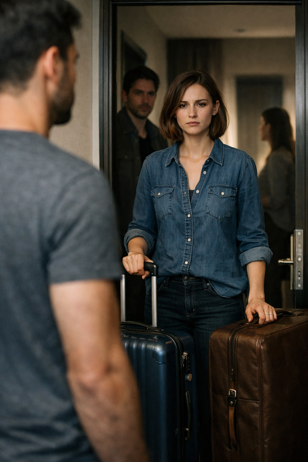 Suo marito restò in piedi sulla soglia, combattuto. Poi prese le valigie e uscì sul pianerottolo.
