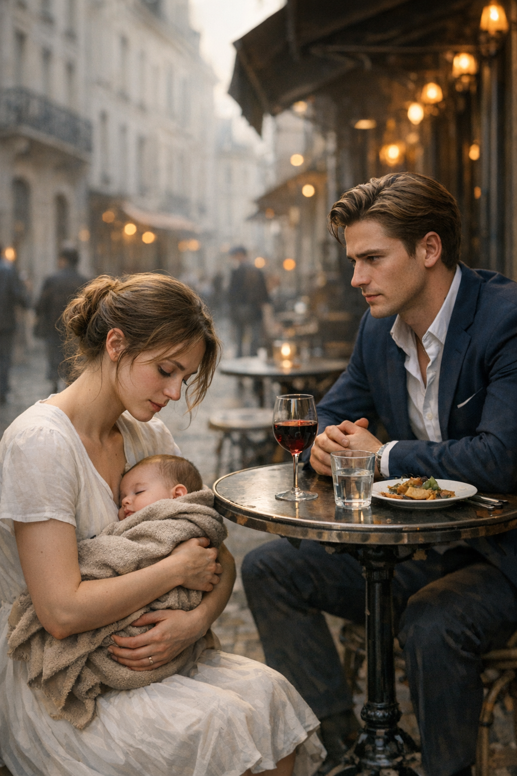Si inginocchiò accanto al suo tavolo sul marciapiede affollato, stringendo teneramente il suo bambino. “Per favore, non sto chiedendo soldi—solo un momento del suo tempo.” L’uomo in giacca guardò su dal bicchiere di vino, ignaro che la sua semplice richiesta avrebbe stravolto tutto ciò che credeva di sapere.