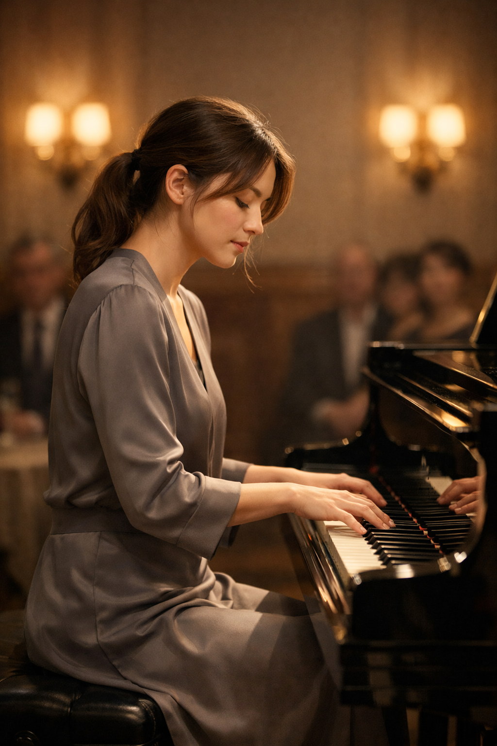 Chiesi che spegnessero le luci nella sala mentre mi avvicinavo al pianoforte. Mi vergognavo del mio passo incerto e dei miei abiti da lavoro semplici. Ma quando le luci si riaccesero e le mie dita toccarono i tasti freddi, qualcosa scattò dentro di me.
