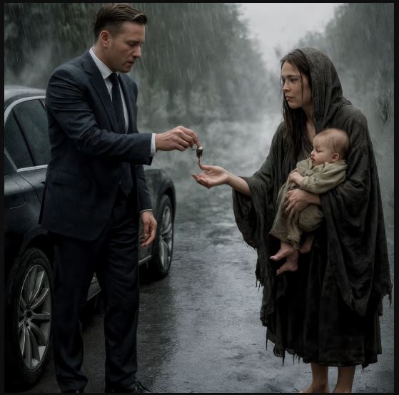 Un milionario, diretto all’aeroporto, vede un mendicante con un neonato sotto la pioggia e gli lascia le chiavi della propria villa… ma al ritorno scopre qualcosa di incredibile! 😱